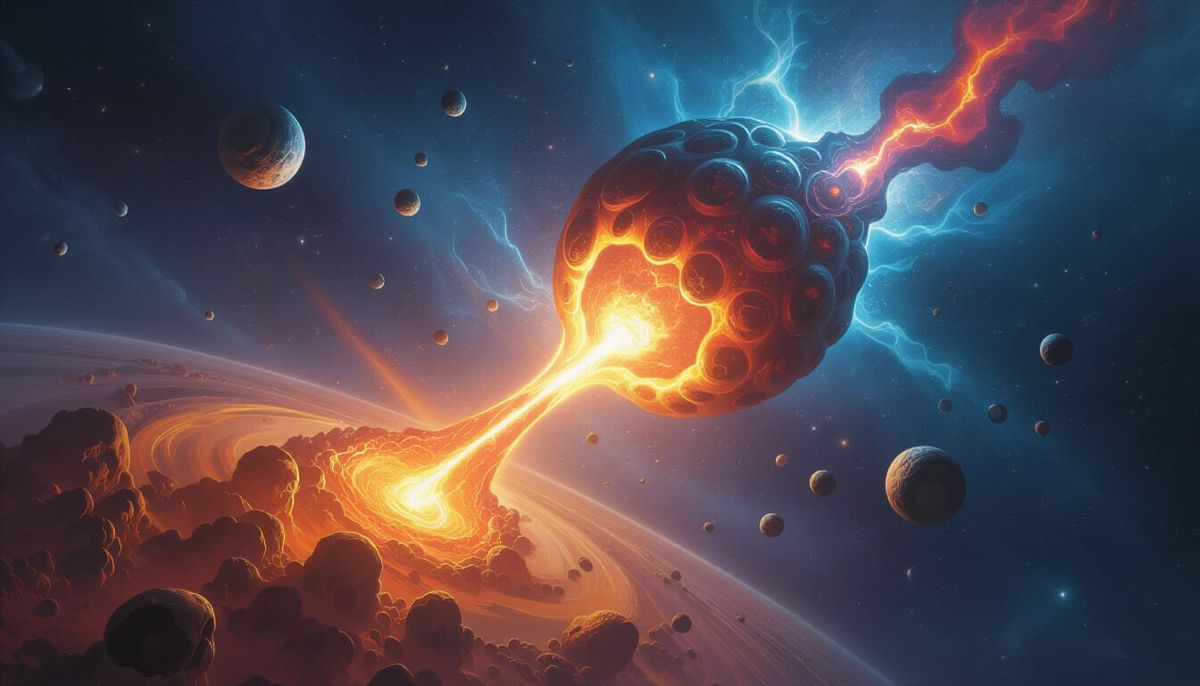 This image shows a cosmic parasite consuming its twin, linked by a plasma umbilical cord, birthing a quasar. Rendered with ultra-detailed, 8k resolution concept art and cinematic lighting.