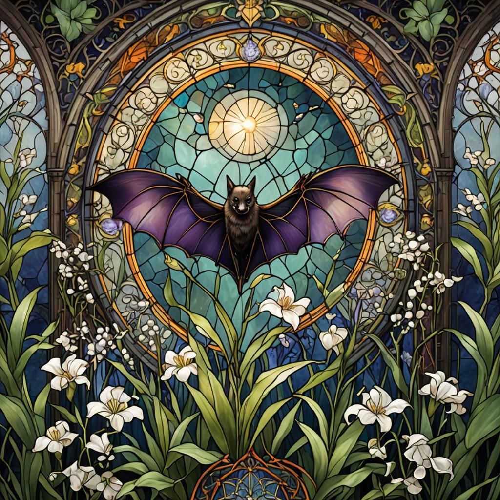 A stunning stained glass image depicting a flying fox bat silhouetted against a moonburst, surrounded by lily of the valley and iris flowers in an art nouveau style.