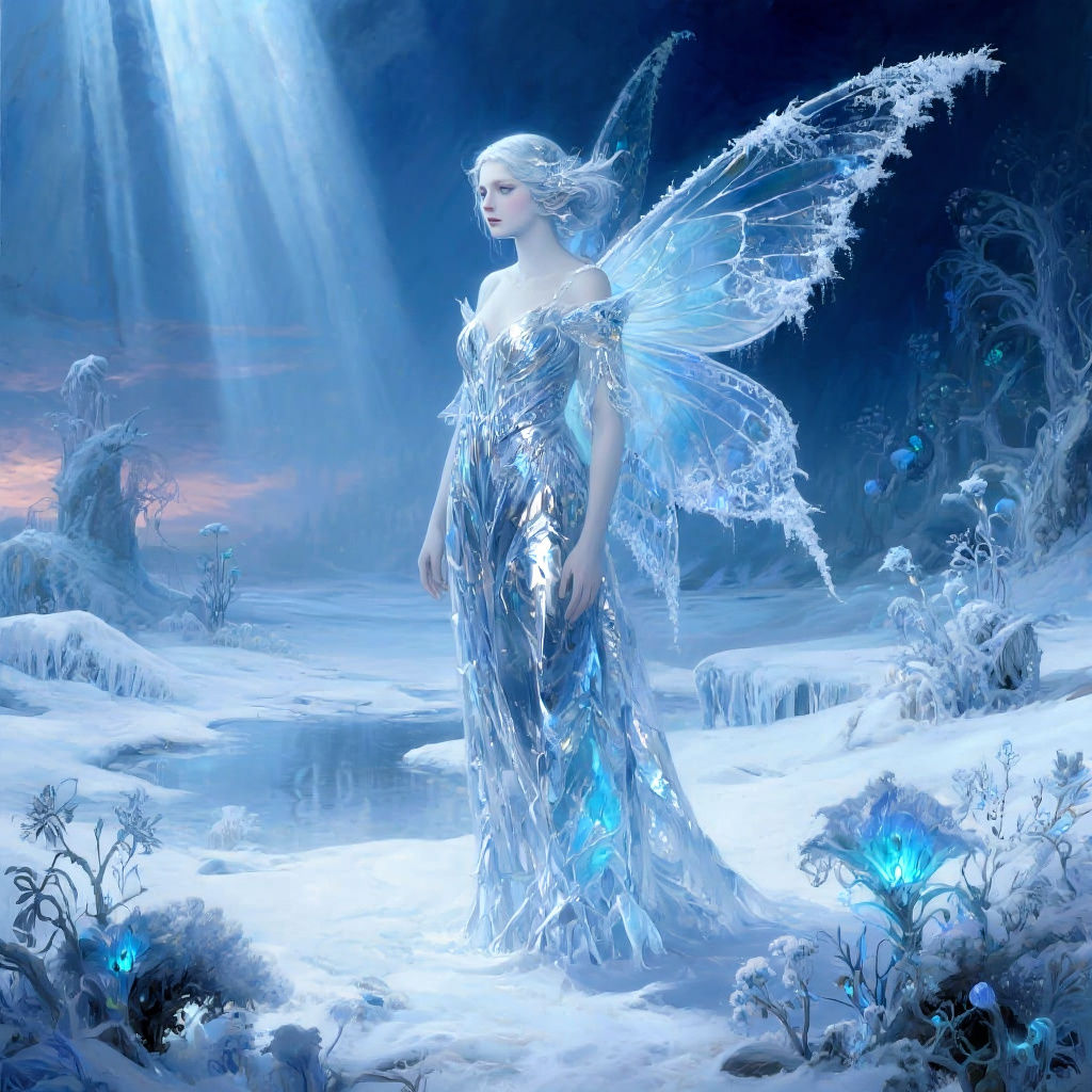 This image depicts a surreal winter fairy scene bathed in dramatic lighting, evoking a sense of fantasy and wonder. The artwork features intricate details and a mystical atmosphere.