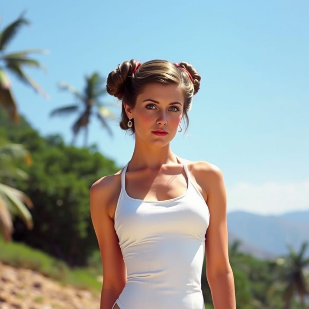 This image captures a young Princess Leia Organa posing confidently in a white swimsuit on the sun-kissed planet of Alderaan, with her signature cinnamon buns hairstyle and a classic Hollywood-inspired photography style reminiscent of the 1970s.