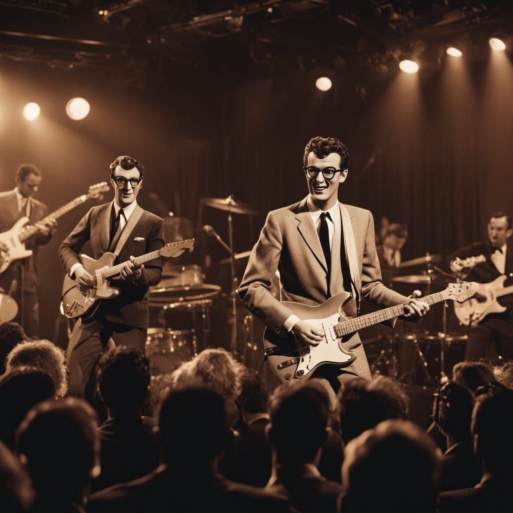 Cinematic film still capturing Buddy Holly and his band performing energetic rock 'n' roll on stage. Features nostalgic 1950s fashion and a warm, sepia-toned atmosphere.