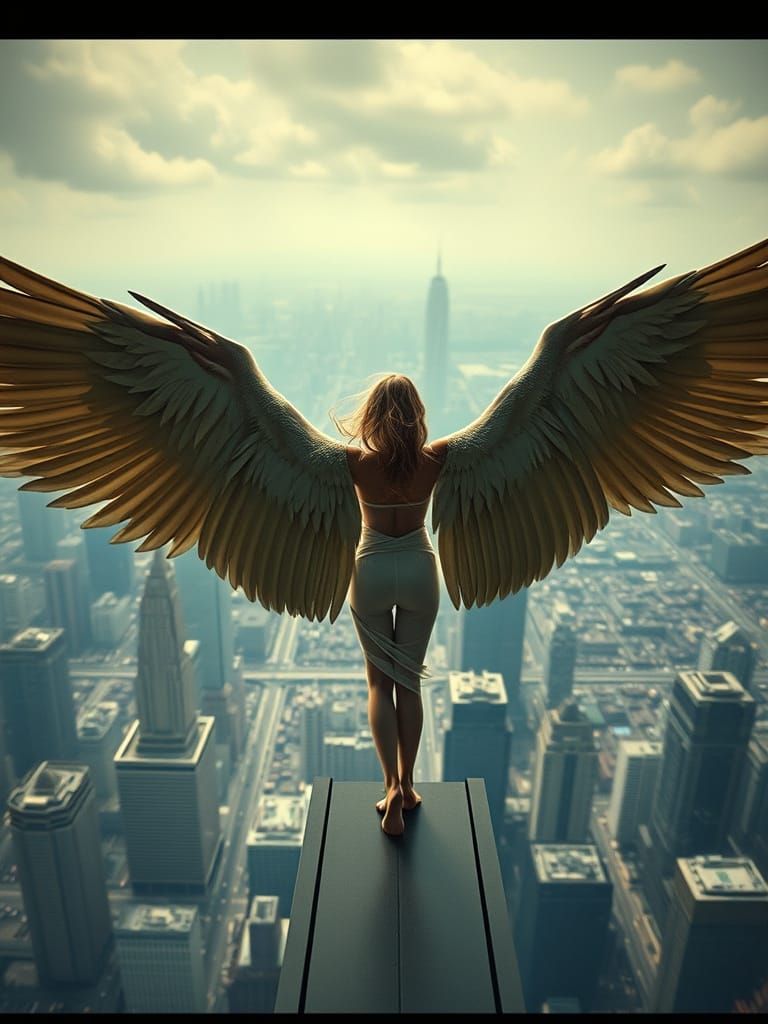 Ein engelsgleiches weibliches Wesen Barfuß mit Flügel auf einem hohen Wolkenkratzer