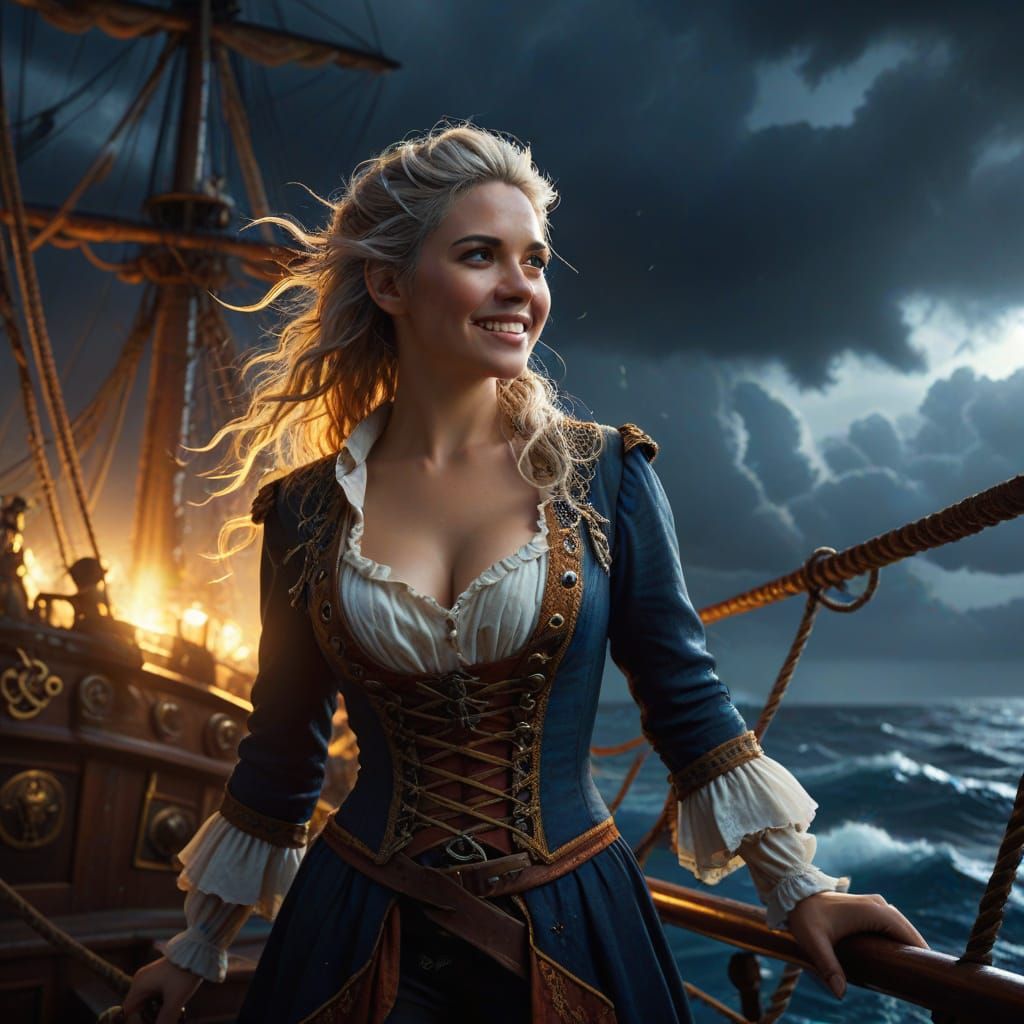 A pirate captain woman smiles on a galleon deck, illuminated by dramatic lightning. This hyperrealistic concept art features a deep color gradient and intricate detail.
