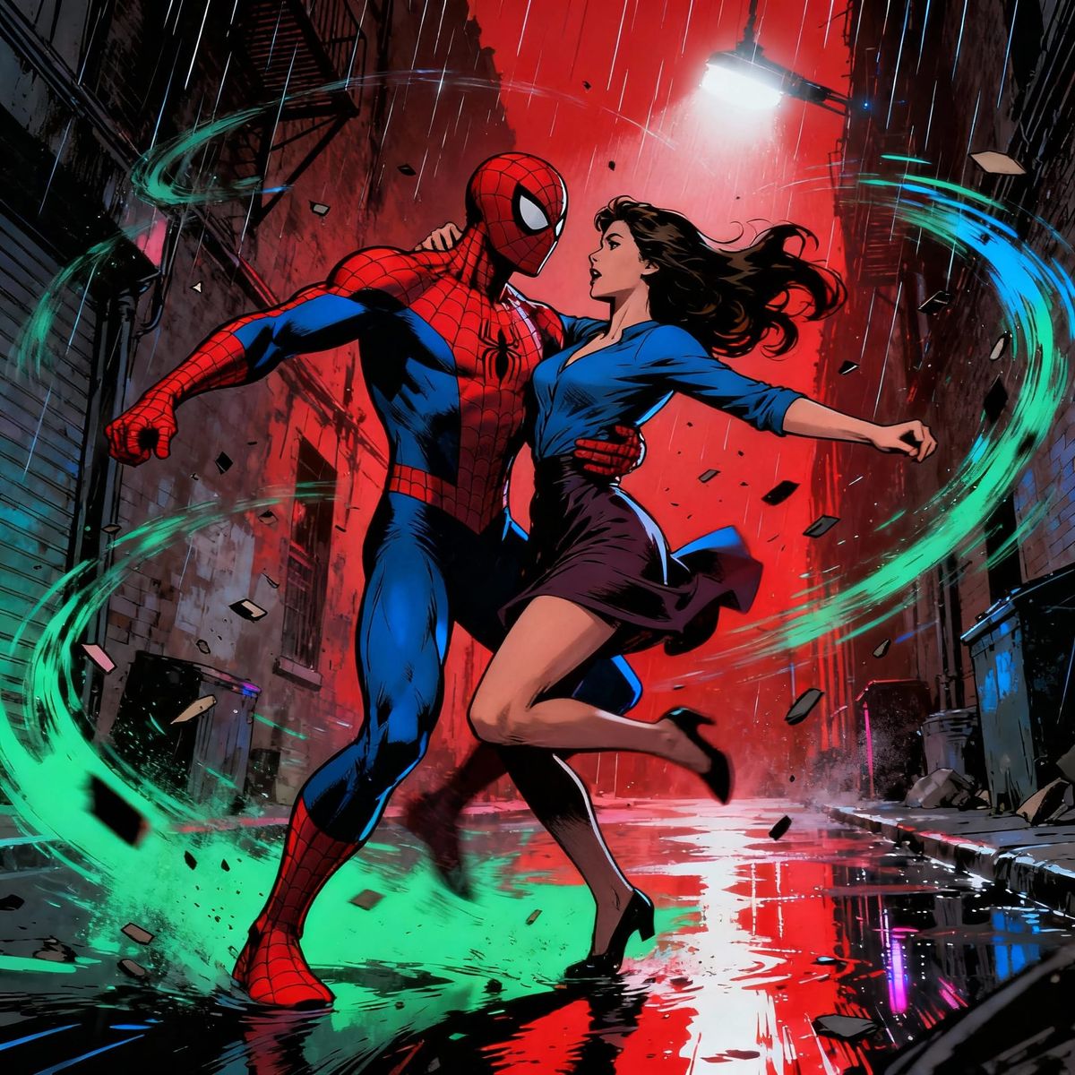 A dynamic comic book illustration of Spider-Man and Mary Jane dancing in Queens. Vibrant colors and bold lines create an intense, cinematic scene.