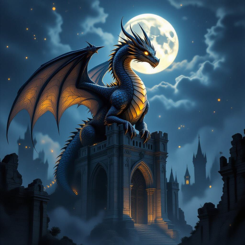 A majestic gothic dragon, its scales shimmering with an ethereal glow, perched atop a towering, ancient castle ruin. Moonlight filters through broken archways, casting long, dramatic shadows. The dragon's eyes, like molten gold, hold an ancient wisdom. The scene is rendered in a hyperrealistic style.