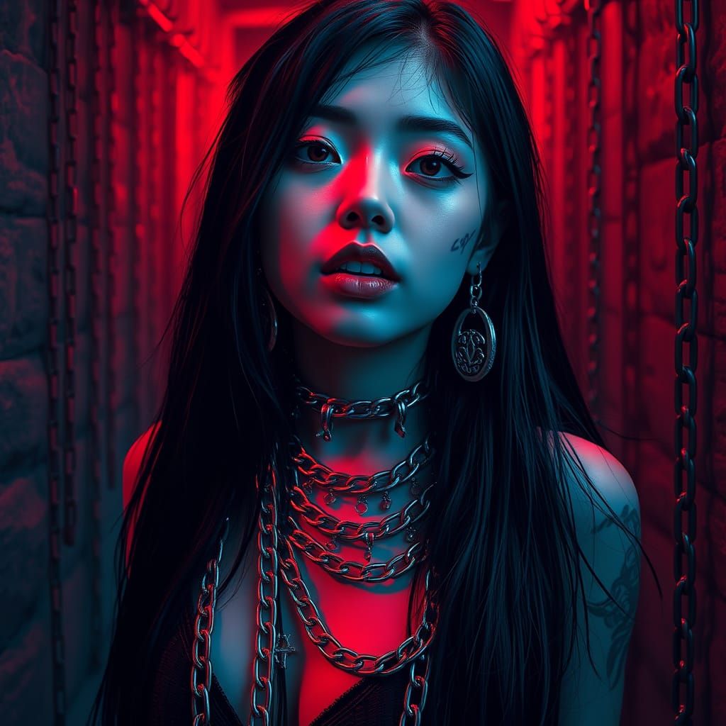 This image shows a young woman with long black hair, face tattoos, and metal jewelry, set against a dark, old dungeon backdrop with chains and a blood red glow, capturing a futuristic, nostalgic essence