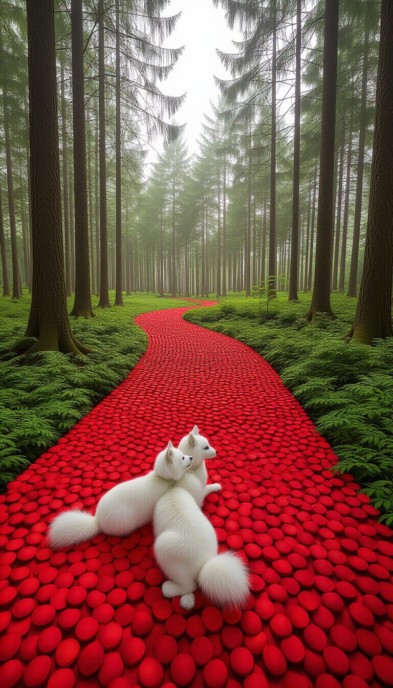 A heartwarming, photorealistic image of two affectionate white puppies playing against a vibrant red backdrop. The scene is rendered with cinematic lighting, rich textures and film grain to create an epic, visually stunning atmosphere.