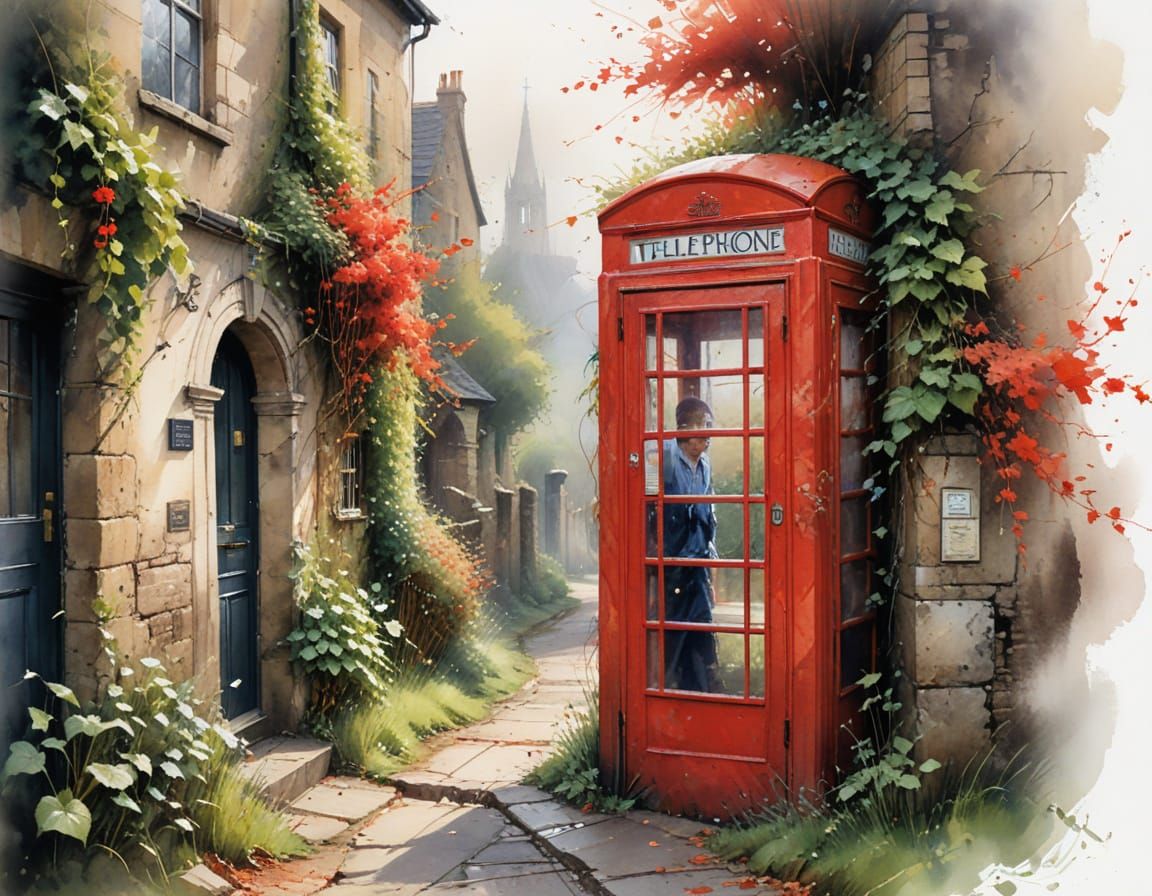 A photorealistic image of a classic red telephone box on a foggy village lane, with ivy-covered walls. Rendered in a delicate, expressive watercolour style with splashy white space.