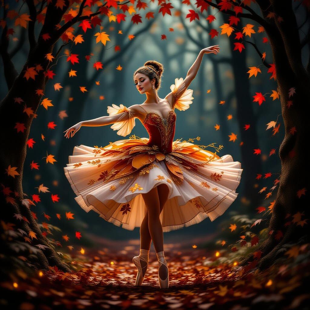 A graceful ballerina en pointe, dressed in a swirling autumn-inspired costume of orange, gold, and amber. Her skirt billows like falling leaves, with delicate leaf-shaped embellishments and translucent layers that shimmer with golden sparkles. She dances in a dark, enchanted forest, surrounded by swirling ...
