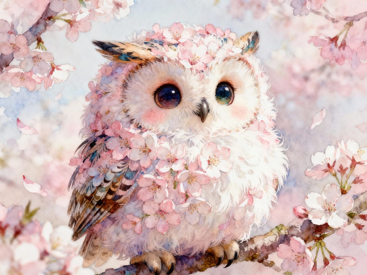 This image features an adorable chibi owl crafted from fluffy cherry blossom petals, rendered with intricate detail and a soft, polychromatic watercolor style. It showcases a perfect composition with exceptional clarity.