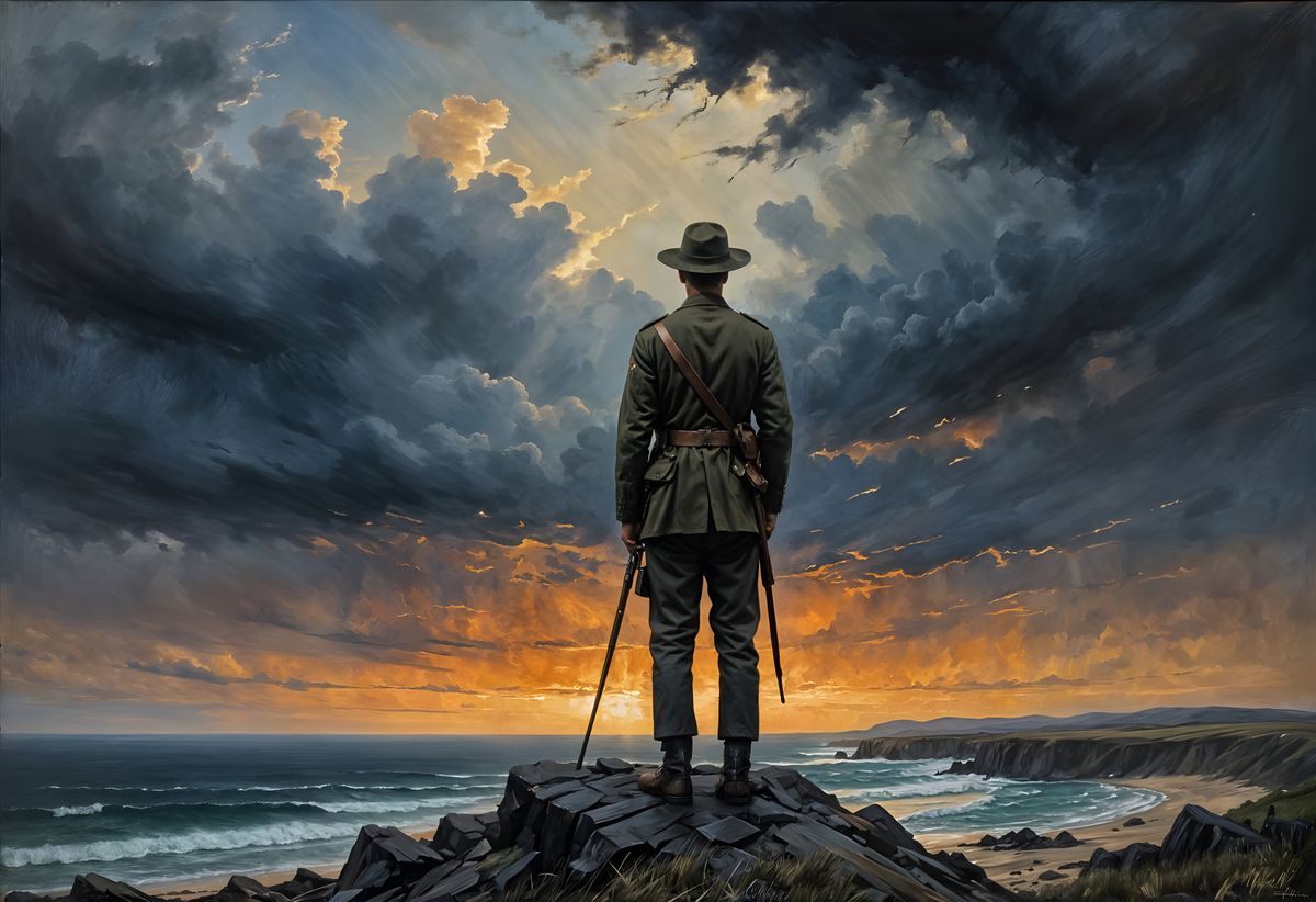 A poignant depiction of a lone WWI digger in solemn reflection, set against a stormy southern sky, with ghostly figures of fallen mates rising from the mist, rendered in textured impasto strokes and luminous chiaroscuro.