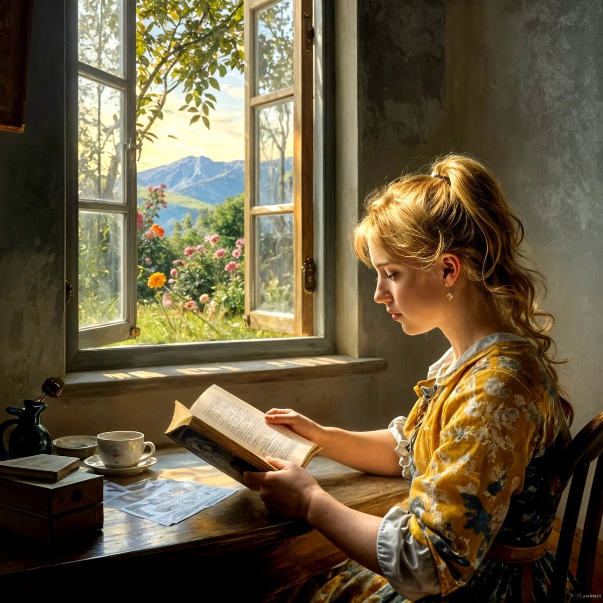 A girl with golden hair, in front of a desk, reading a book in a saloon, late afternoon golden sunlight filtered through a large window, rendered in the Dutch Golden Age realism. The large window opens a view of summer garden and distant mountain. The pearlescent light diffusion creates a luminous ...
