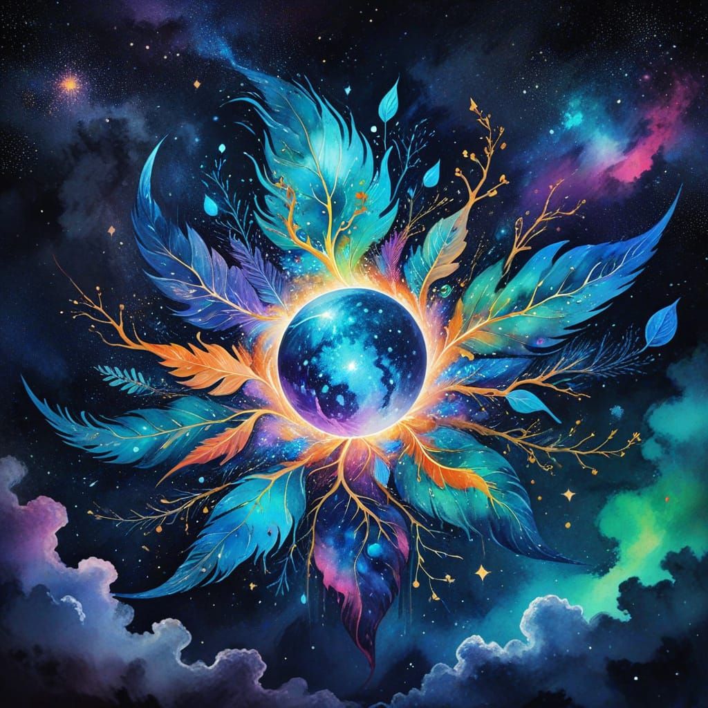 This image showcases an elegant nature scene rendered with luxurious watercolor hues. It features a cosmic, holographic illustration with high resolution.