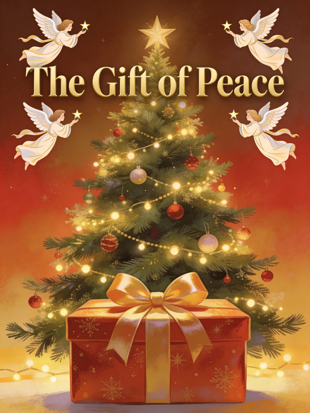A huge beautiful wrapped present under giant decorated Christmas tree overhead text “The Gift of Peace” with flying angels above.