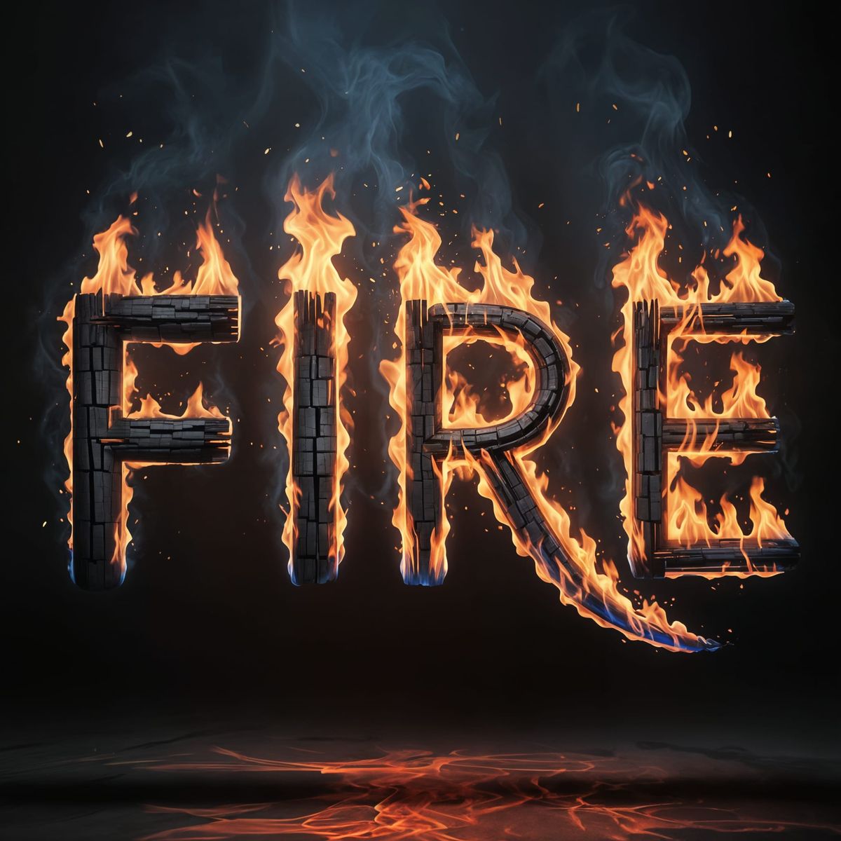 A striking word art design of the word FIRE, featuring realistic dancing flames and glowing embers within the letters. The design uses charred charcoal text and a dramatic, smoky background with high contrast.