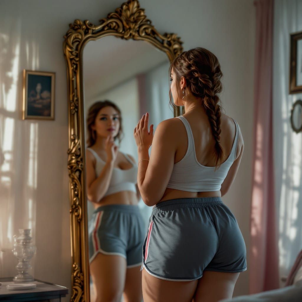 This serene image depicts a confident plus-sized woman standing in front of an antique mirror, surrounded by soft natural light and vibrant colors, as she begins her day with positive affirmations.