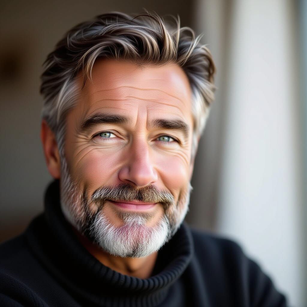 A close-up portrait of an older man with kind blue eyes and a gentle smile, radiating warmth and a desire to share happiness. Professional studio photography with bokeh.