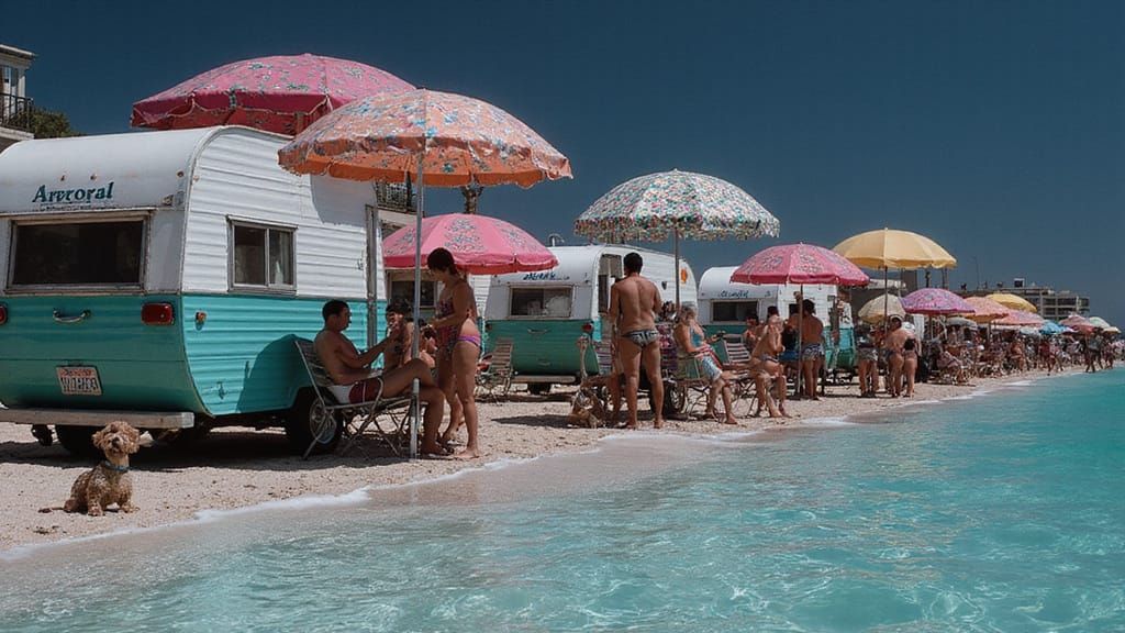 A vibrant image of vintage caravans along a sunny seaside promenade. The scene is filled with colorful bunting, retro beach chairs, patterned umbrellas, and people in 1960s swimwear enjoying ice cream, rendered in bold, saturated colors and retro details.