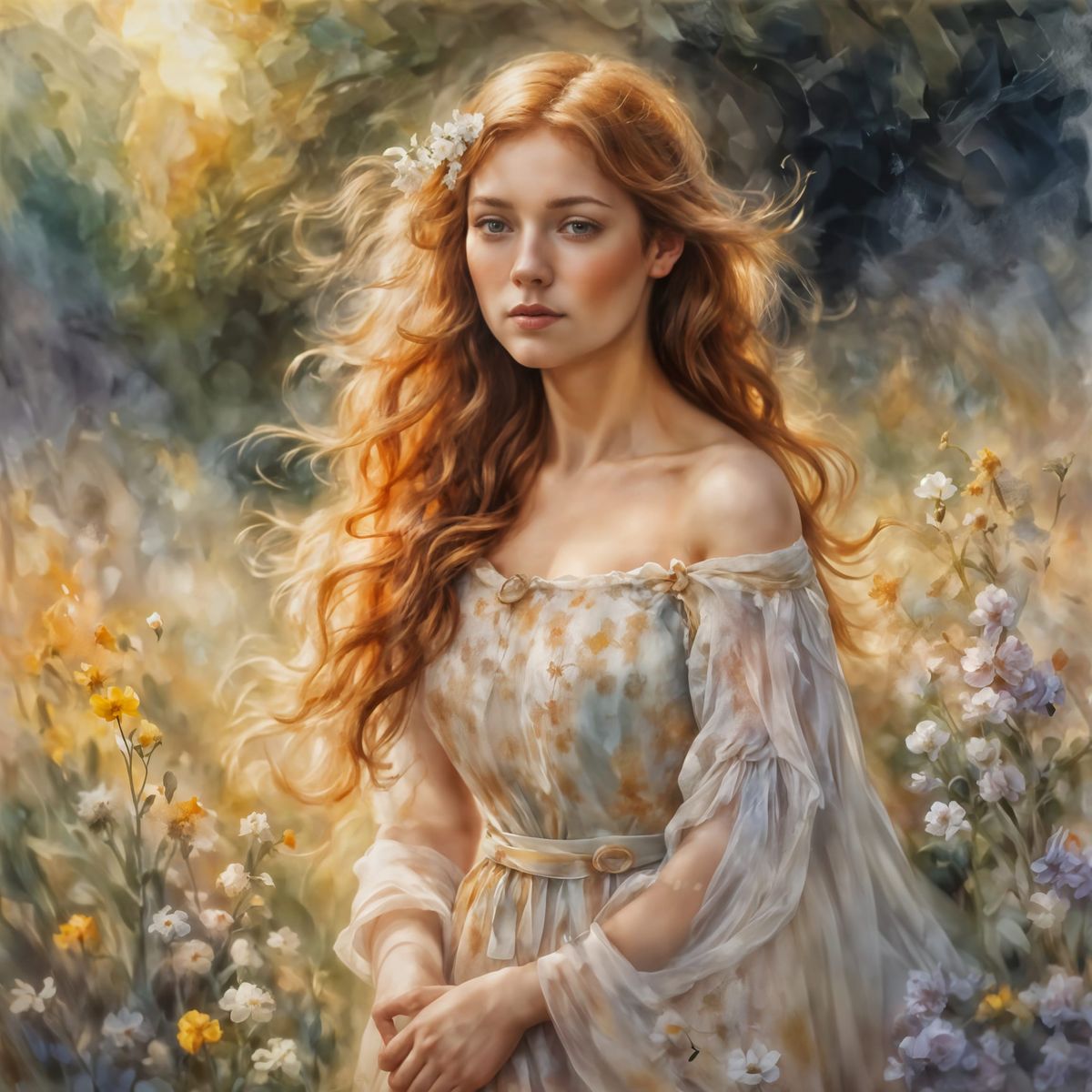 A close-up watercolor portrait of a beautiful woman with auburn hair in a wildflower field. Sunlight filters through the trees, creating a warm, romantic, and serene atmosphere.