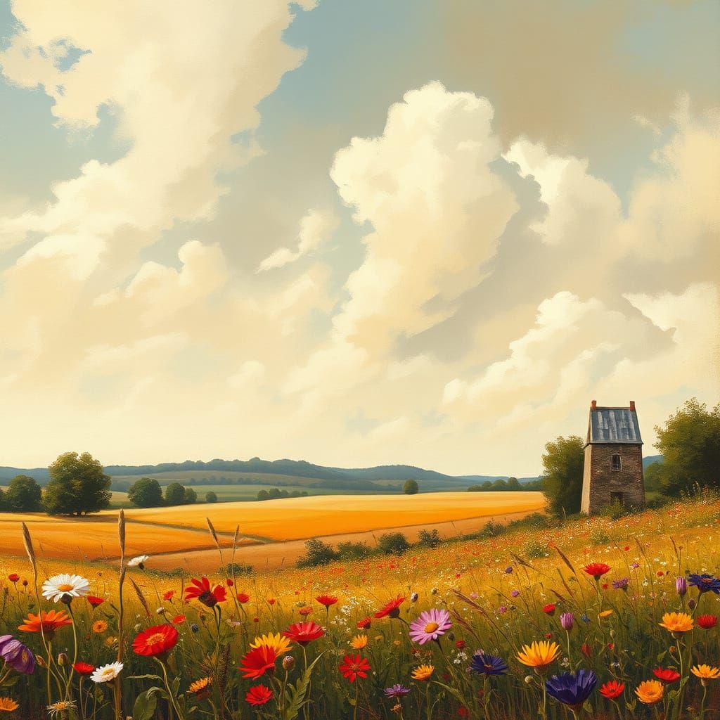 A vintage sepia-toned rural scene featuring wildflowers under a soft, cloudy sky. The image evokes impressionistic painting with mixed media elements and high contrast.