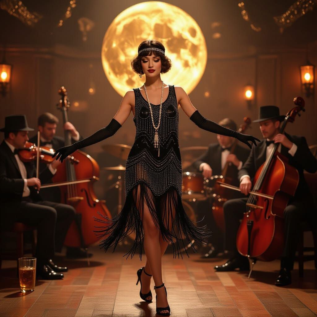 This image shows a flapper in a beaded dress dancing in a crowded 1920s speakeasy, complete with jazz musicians and flowing moonshine. The scene has a dreamlike vintage futurism aesthetic.