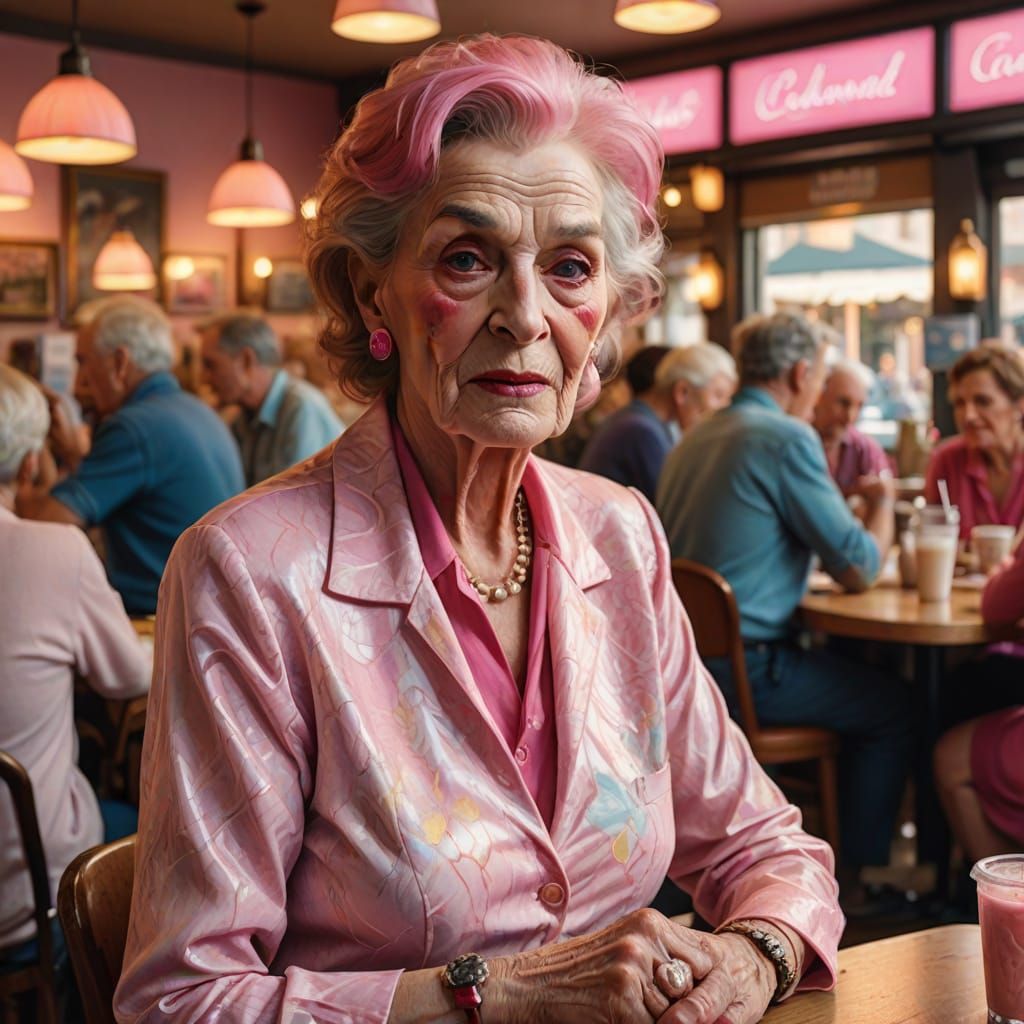 This image shows an elderly transgender person in a cafe, exhibiting vibrant digital art style. The subject has rosy cheeks, deep wrinkles, bright pink nails, and is illuminated by soft, warm light.