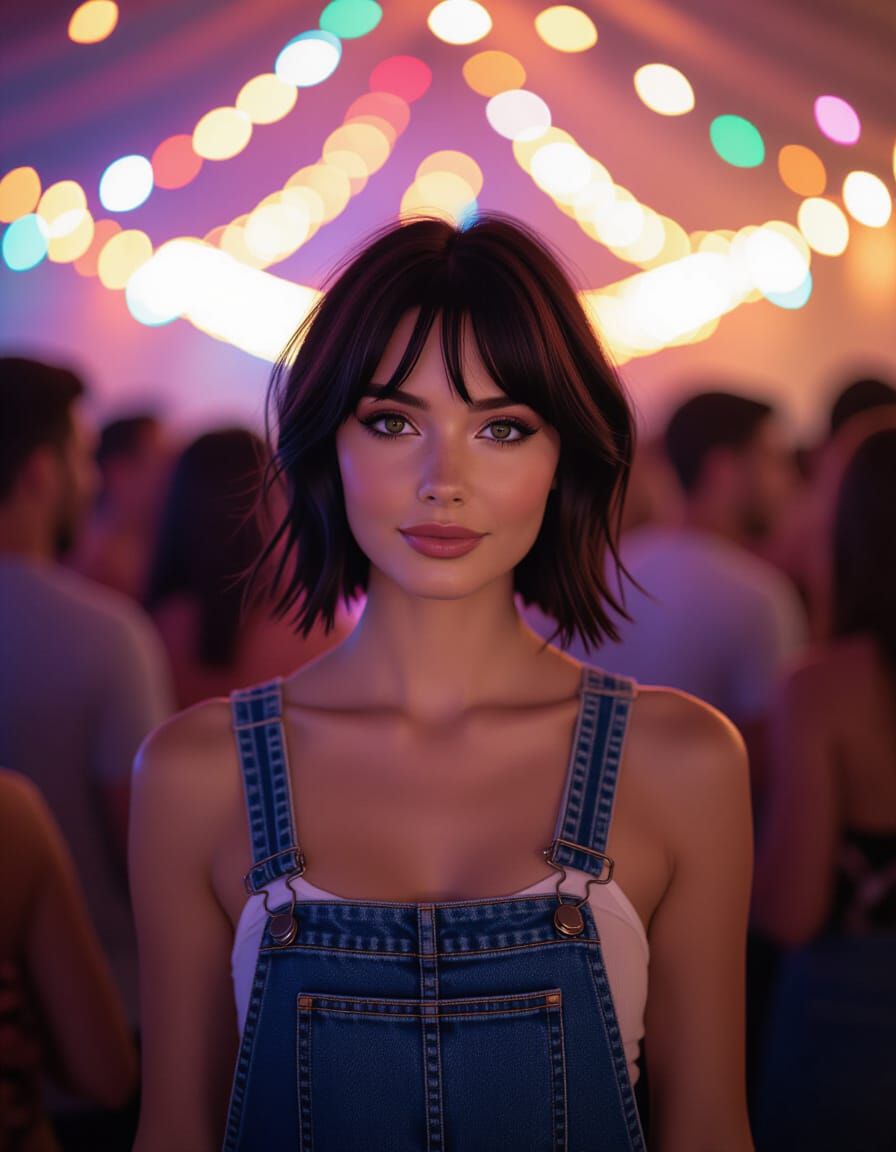 This photorealistic image shows an elf woman with short black hair in denim overalls at a vibrant, brightly lit party. Captured with a wide-angle lens, it has a cinematic feel.