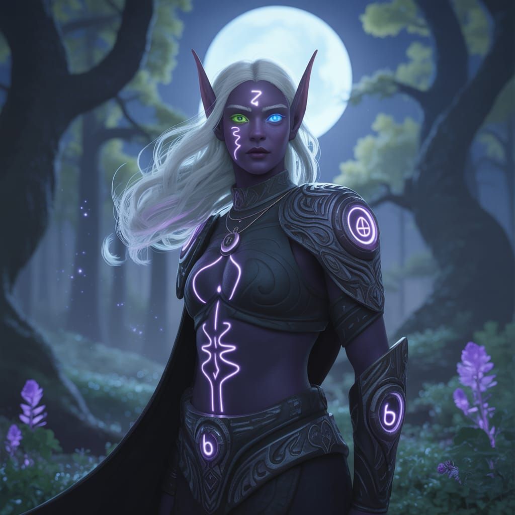 A solitary elf with striking heterochromia stands in a moonlit forest, clad in obsidian armor. Bioluminescent flora casts an ethereal glow, with deep purples and yellows in art nouveau style.