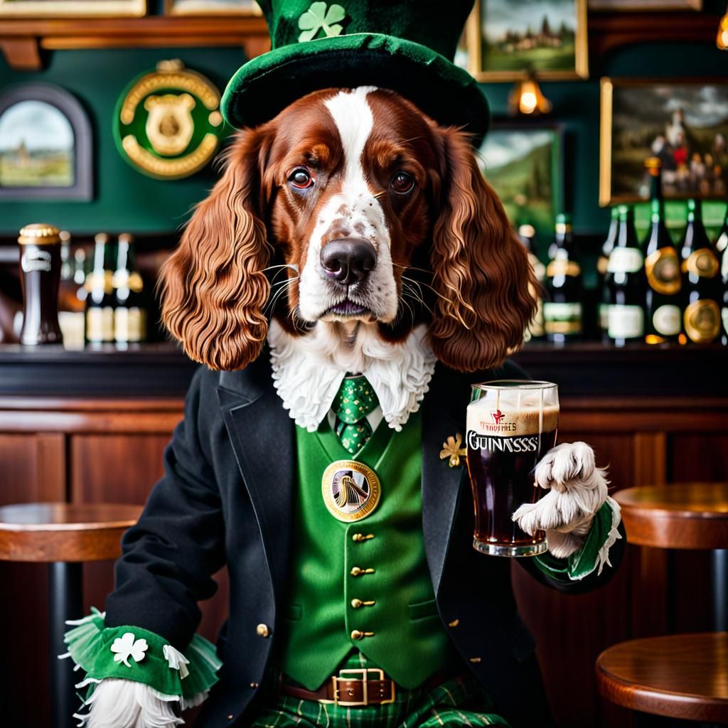 A striking picture of an anthropomorphic Irish spaniel in St. Patrick's Day attire, enjoying a pint of Guinness in an Irish pub with a traditional band playing, captured with professional photography techniques.