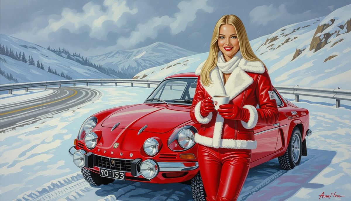 This image depicts a confident woman in a red leather outfit leaning against a vintage Alpine car on a snowy mountain road. The artwork features thick, textured paint layers in a neo-impressionist, expressionist style.