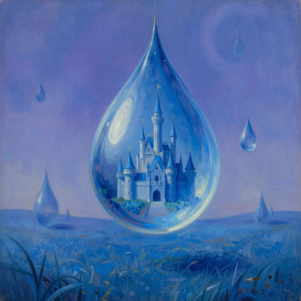 This image showcases a surrealist oil painting featuring a translucent blue raindrop containing a miniature castle, set in a dreamy blue meadow with distorted, melting shapes.