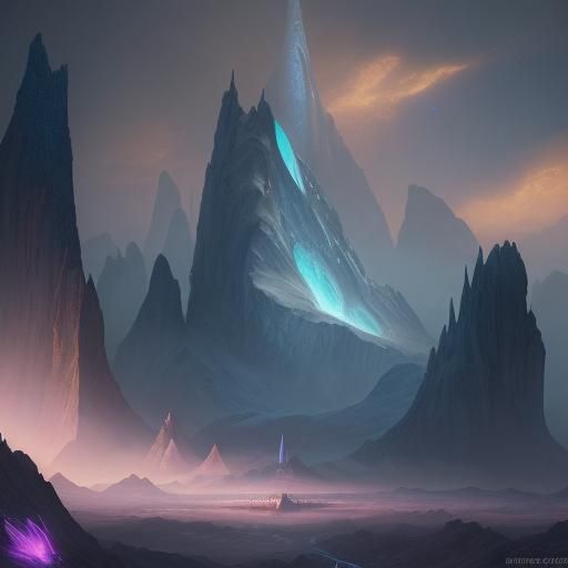 A stunning image of surreal crystalline peaks refracting light to create vibrant, dreamlike illusions. Ethereal creatures roam this landscape in a digital painting style with dynamic lighting.