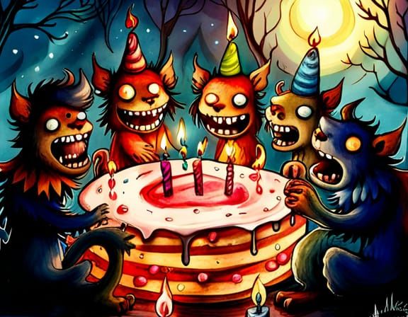 This image shows cute manga-style werewolf monsters celebrating a birthday. The watercolor art features sharp details and calligraphy in liquid black ink, creating a whimsical scene.