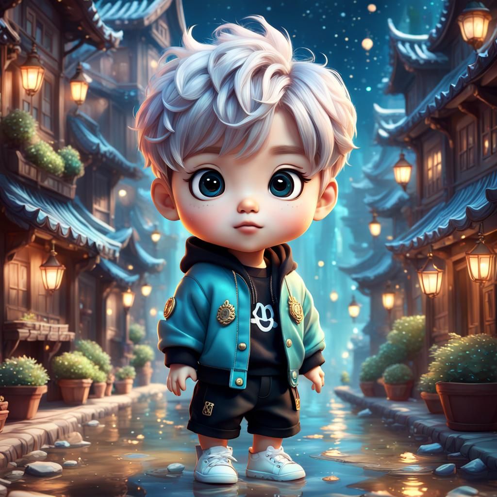 This image shows a cute chibi-style baby inspired by BTS's J-Hope, rendered with large, sparkling eyes and intricate details. The artwork features deep colors and a fantastical aesthetic.