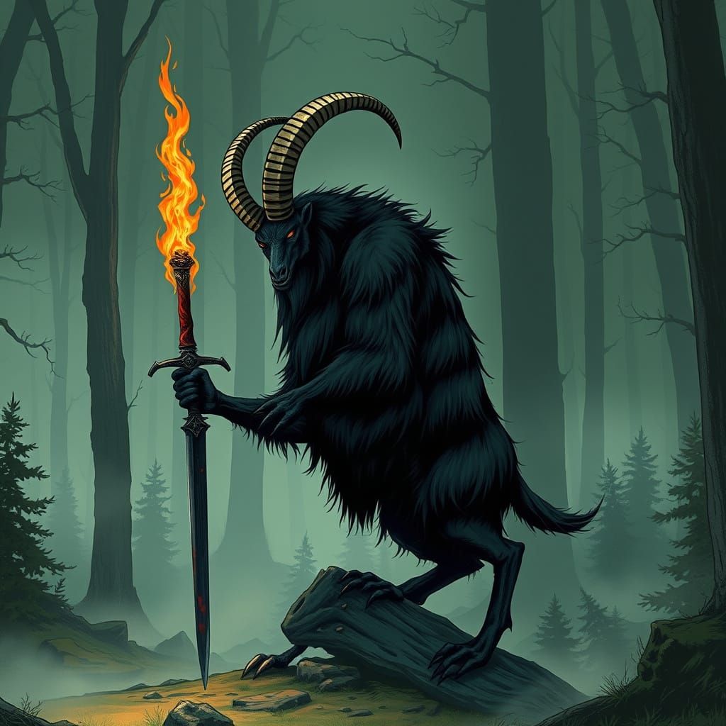 This image shows a towering weregoat with shaggy black fur and sharp claws, holding a burning sword in a foggy clearing surrounded by dark forest, in a High Gothic style with intricate illustrations and a gritty aesthetic