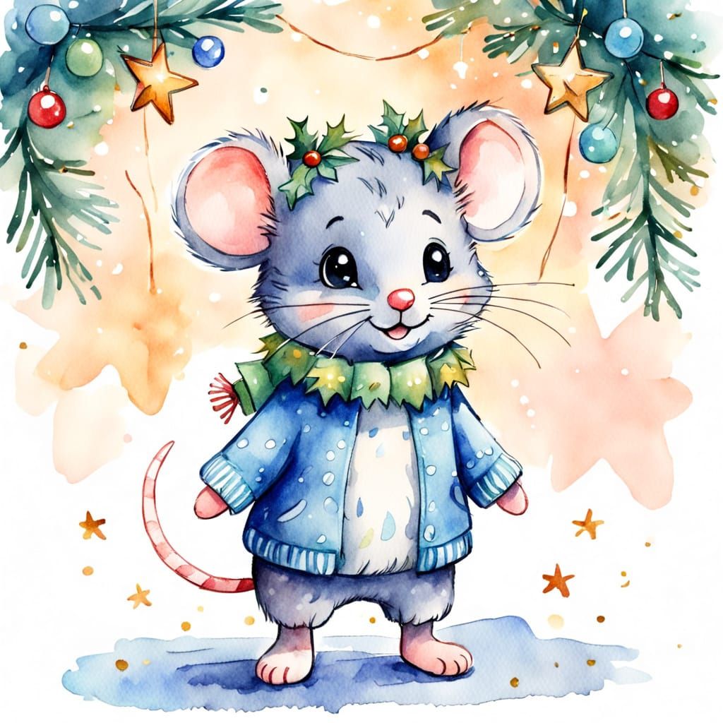 This image shows a charming toy mouse cub standing on two legs, holding a festive garland. Rendered in a whimsical watercolor sketch style with delicate brushstrokes and soft texture, it evokes a sense of holiday joy.