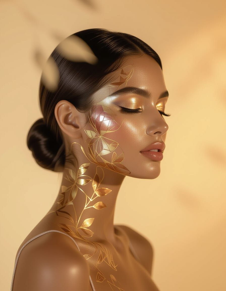 This image shows a metallic photograph of a serene female profile that shimmers with an ethereal glow. Bronze and gold tones blend smoothly, highlighting geometric and floral patterns against a hazel and gold backdrop.