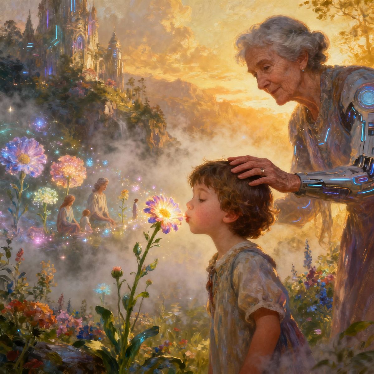 Oil painting. Medium shot. A young child blows a dream cycle flower, showing all stages of life. The older version reaches through and pats the younger version’s head. Futuristic meets current with intricate details. Medium shot. Ethereal fantasy, hyperdetailed, mist. Soft, glowing light on fantasy ...