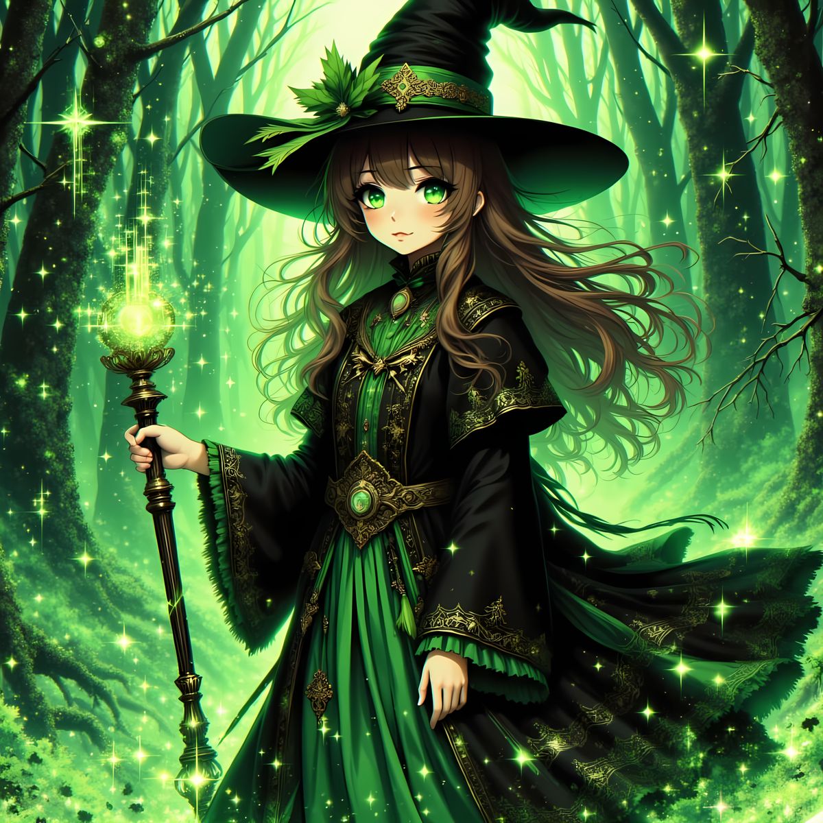 This image shows an adorably cute magic caster girl in an 80s anime style, featuring a zentangle aesthetic with striking green, cyan, black, white, gold, and silver contrast. The scene is eerie yet playful.