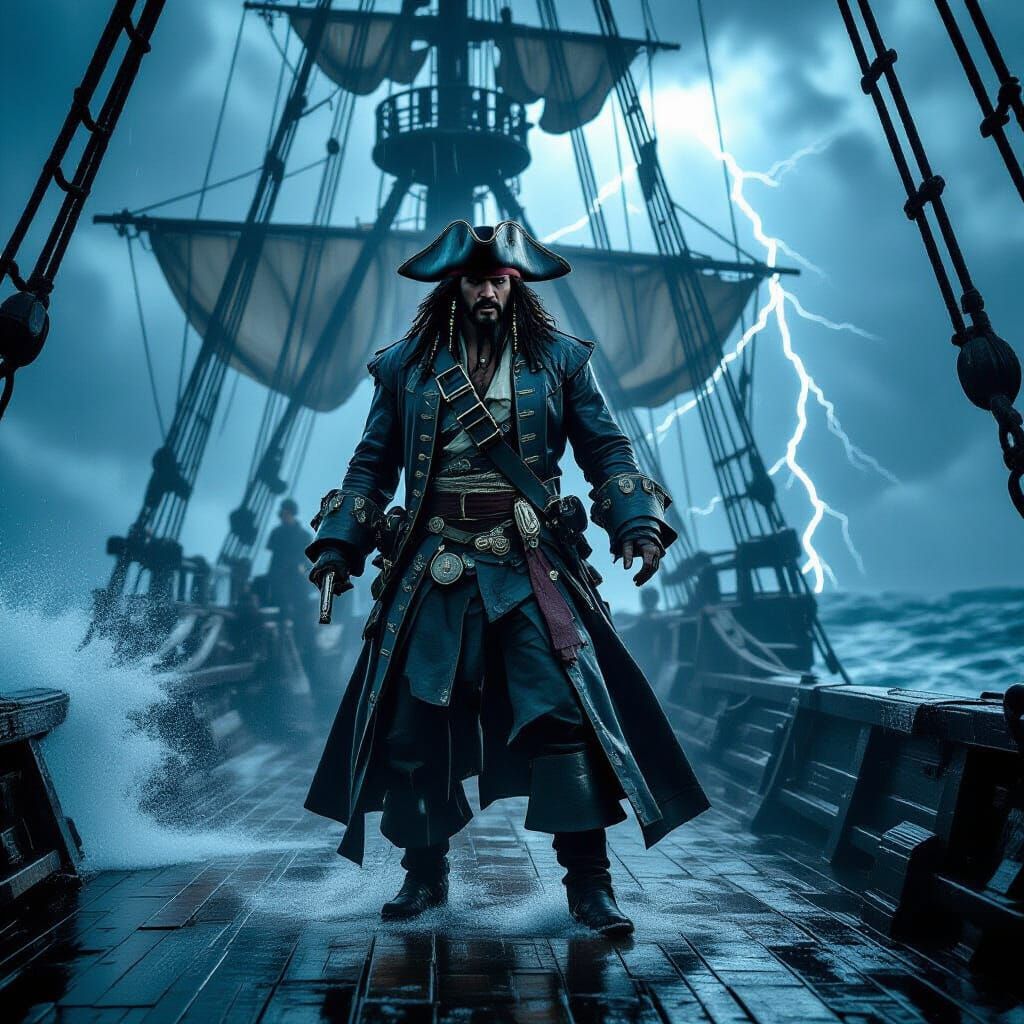 This image shows a fierce pirate with a weathered coat and hat on a large ship. The vessel is tilted amidst stormy seas, captured with dramatic lighting, film grain, and a cinematic feel.
