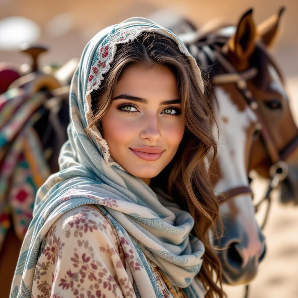 Easily generate stunning close-up portraits of Bedouin women and their Arabian horses with our free AI image generator.