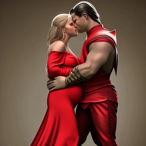 A vivid digital artwork of a pregnant blonde woman in a red dress kissing a dark-haired man. The image features dynamic lighting, intricate details, and complementary purple and yellow tones.