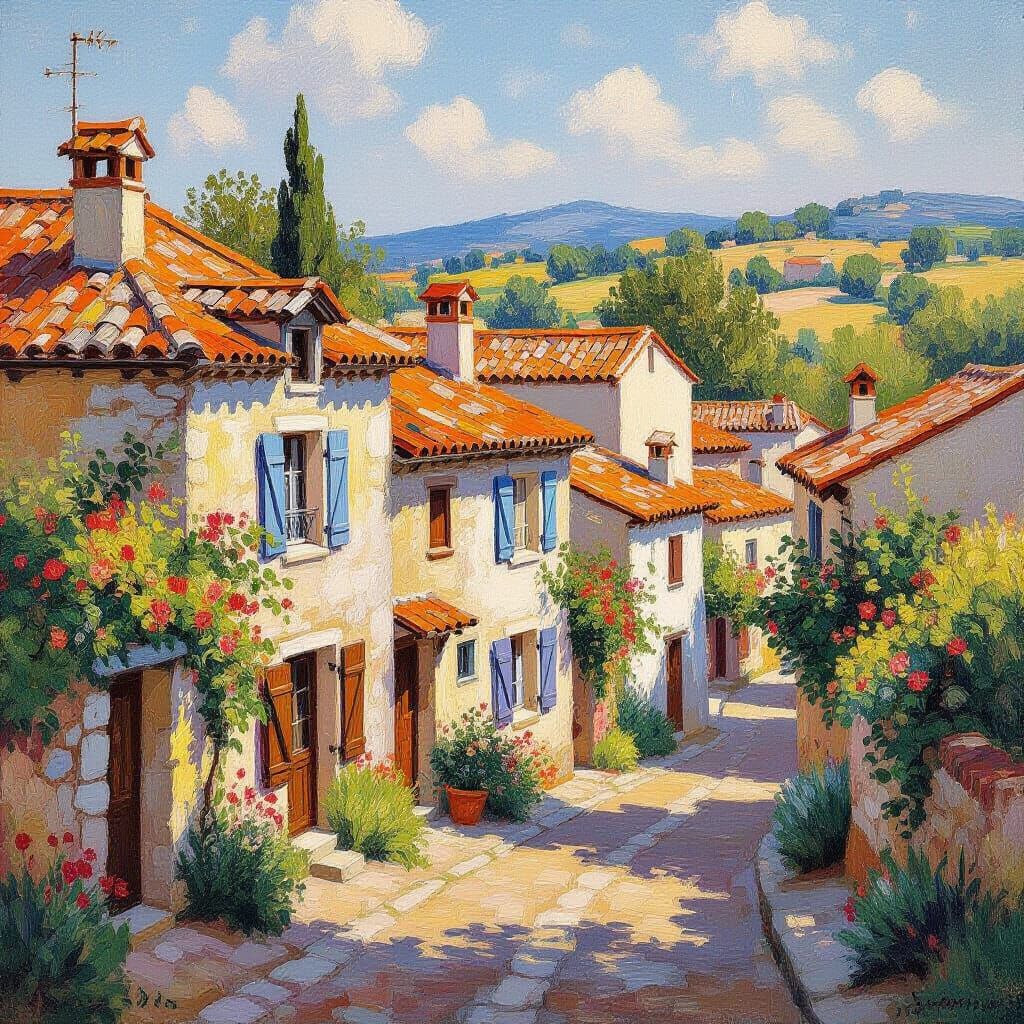 This image shows a traditional French village featuring terracotta rooftops and stone walls. The village is surrounded by lush greenery and flowers rendered with soft brushstrokes and warm light, in an impressionistic style.