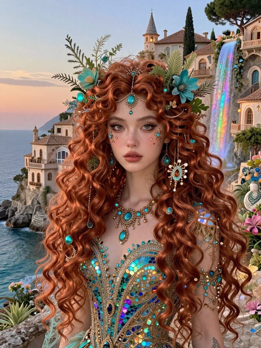 Gorgeous adorable witch goddess, front portrait queen, long flowing curly copper hair, herbs jewel tones, flowers, teal and copper, by victo ngai, kilian eng, dynamic lighting, digital art, art by james jean, takato yamamoto, inkpunk minimalism, A breathtaking mediterranean fantasycore villa village ...