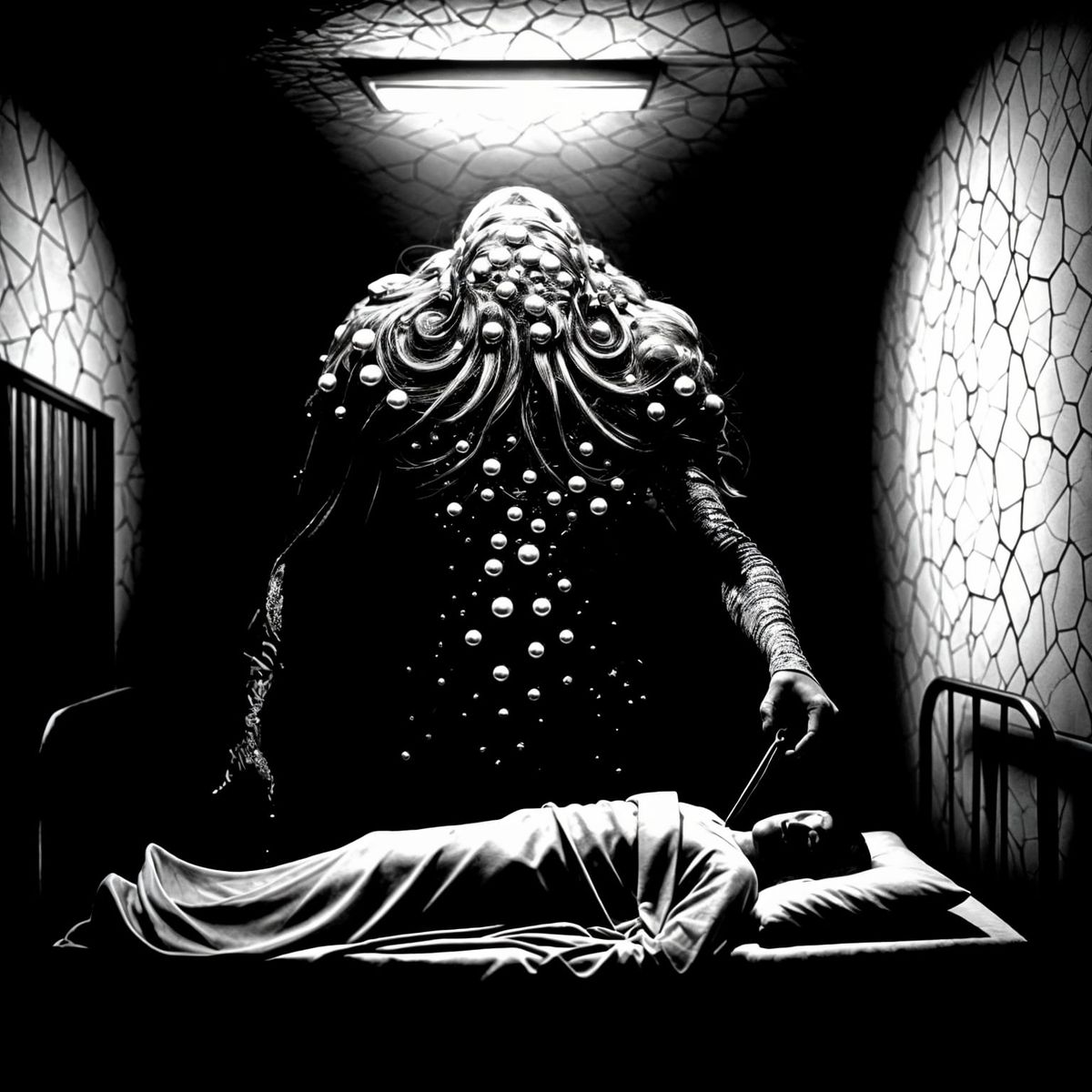 A terrifying cosmic horror, Azathoth, looms over a sleeping figure, its body covered in glowing eyes, as it holds a needle containing a deadly virus in a dark, dimly lit bedroom