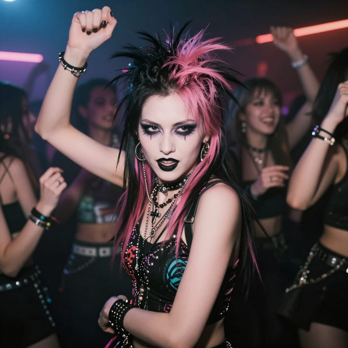 This image shows a young punk girl with black and pink hair dancing energetically in a vibrant nightclub. Captured in a cinematic film style with film grain and dramatic lighting.