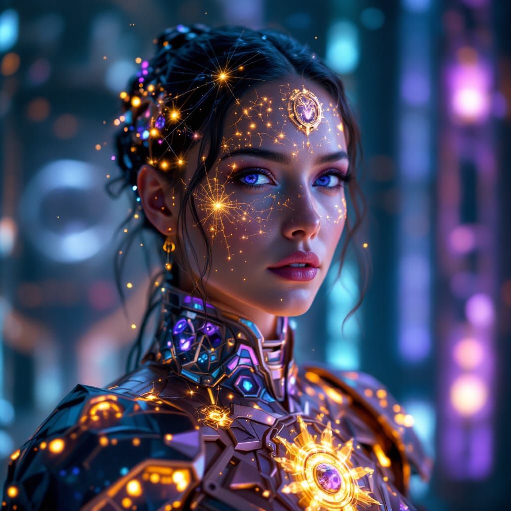 A hyper-real cinematic portrait of an astral priestess blending myth and advanced technology, adorned with aurora-metal filigree and star-powered systems. Rendered with extreme material fidelity and luminous structure.