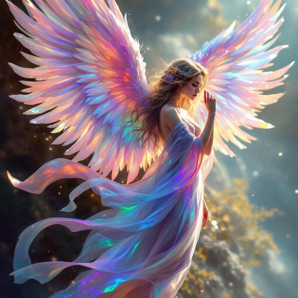 A striking picture of a fantasy angel with iridescent wings and crystalline robes. The angel is set against a shimmering backdrop with dreamlike details and soft textures, in a vibrant digital art style.