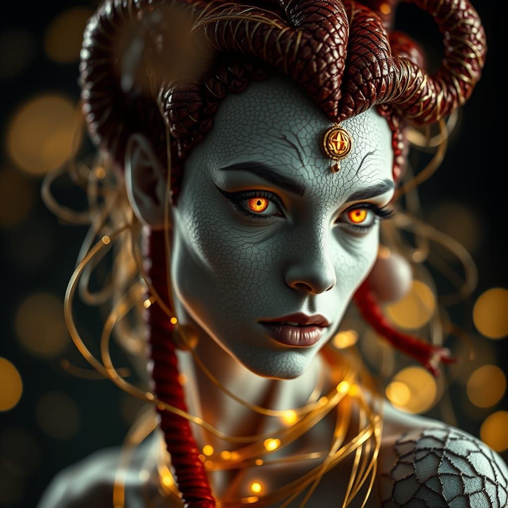 A stunning, high-contrast black and white portrait of a gorgon with glowing eyes and serpent-like hair, rendered with photorealistic detail and cinematic lighting.