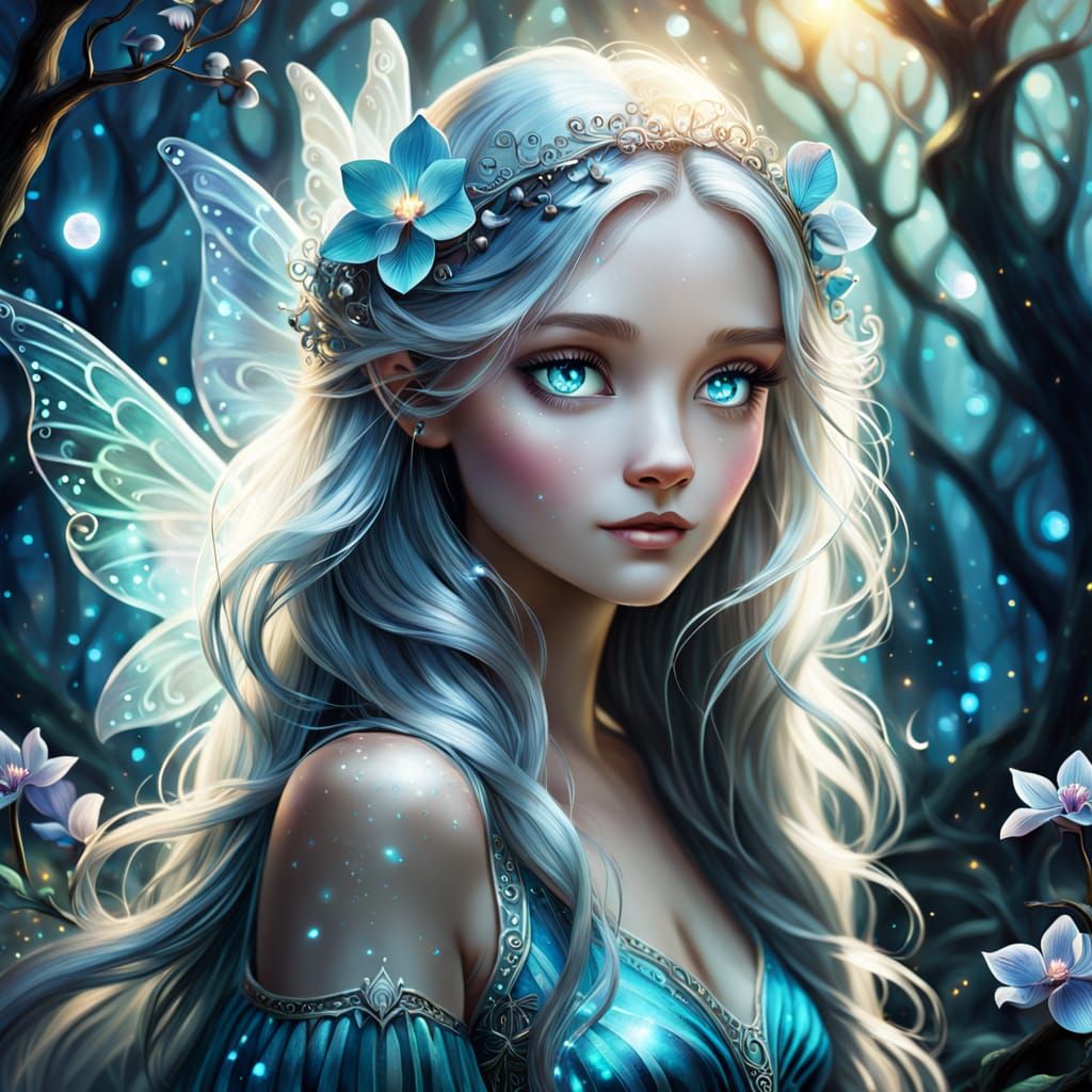 This image shows a dreamy moon fairy with silver and teal hair, twirling in a magical forest. Features watercolor and oil painting techniques with soft focus and ethereal lighting.